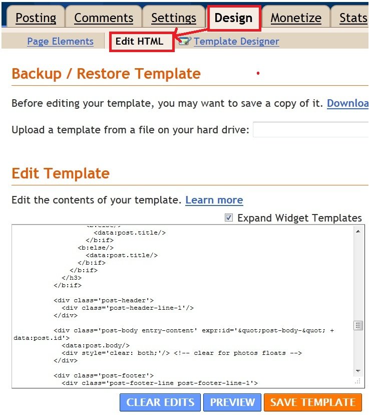 3. Now, go to your Blogger account and select the blog in which you want to put your signature. Go to Design | Edit HTML and find one of the codes below. To find, press Ctrl+f you will get search box.